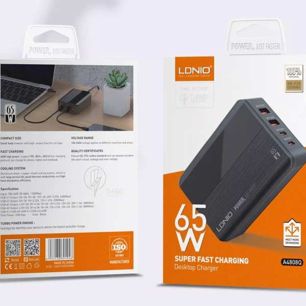 شارژر رومیزی ۴ پورت LDNIO مدل A4808Q یکی از گزینههای پرقدرت و قابلاعتماد برای شارژ همزمان چند دستگاه است که با طراحی جمعوجور و بدنهای مقاوم، به خوبی در محیطهای کاری یا خانگی جای میگیرد. این شارژر با توان خروجی ۶۵ وات از فناوریهای شارژ سریع مانند QC4.0، PD3.0، SCP، VOOC، AFC، FCP و Auto ID پشتیبانی میکند و امکان شارژ سریع گوشیهای هوشمند، تبلتها و حتی لپتاپهایی که از USB-C بهره میبرند را فراهم میسازد. مجهز به ۲ پورت USB-C و ۲ پورت USB-A است که به کمک آنها میتوان تا ۴ دستگاه را به صورت همزمان با سرعت بالا شارژ کرد. نمایشگر LED تعبیهشده روی بدنه وضعیت ولتاژ و جریان خروجی هر پورت را بهصورت لحظهای نمایش میدهد. این شارژر از ۹ لایه محافظتی در برابر حرارت بالا، شارژ بیشازحد، اتصال کوتاه و نوسانات ولتاژ برخوردار است و با بهرهگیری از تراشه هوشمند، توان را به شکل بهینه بین دستگاهها تقسیم میکند. طراحی زیبا، ایمن و کاربردی شارژر A4808Q آن را به گزینهای عالی برای کاربران حرفهای، مسافران و حتی استفاده روزمره در خانه تبدیل کرده است.