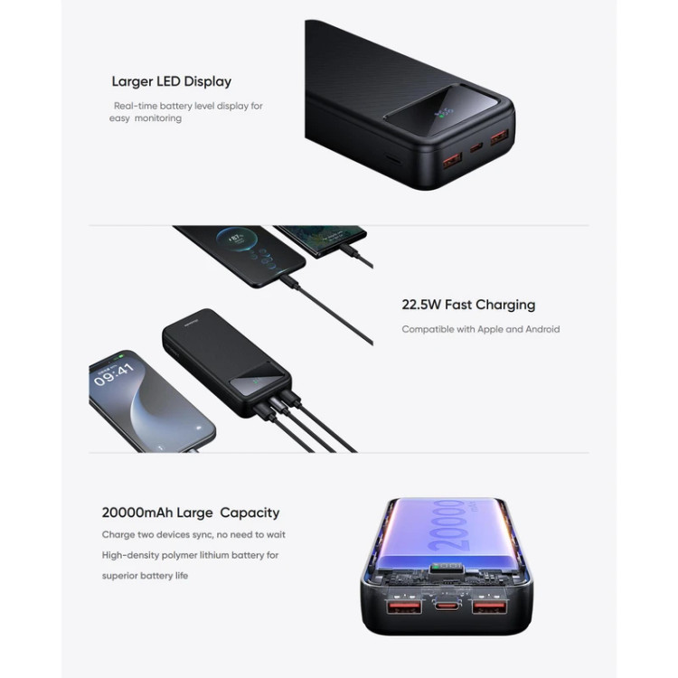 پاوربانک مکدودو مدل MC-423 یک گزینه خوشساخت و قدرتمند برای شارژ سریع دستگاههای دیجیتال است. این مدل با ظرفیت ۲۰۰۰۰ میلیآمپر ساعت طراحی شده و از باتری لیتیوم-پلیمر بهره میبرد. توان خروجی آن حداکثر ۲۲.۵ وات است که برای شارژ سریع گوشیهای هوشمند، تبلتها و برخی دستگاههای کوچک کاملاً مناسب است، اما برای لپتاپهای پرمصرف کافی نیست.