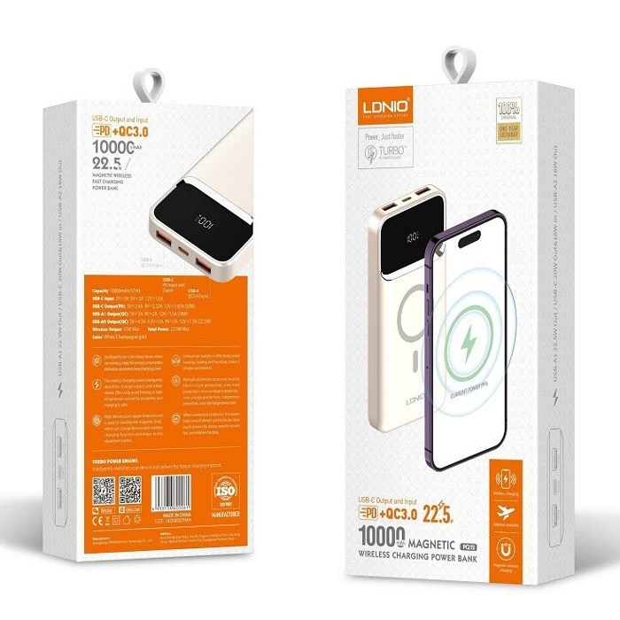 پاوربانک الدینیو مدل PQ12 با ظرفیت 10000 میلیآمپر ساعت، یک شارژر همراه پیشرفته و خوشساخت است که با طراحی مدرن و امکانات متنوع، نیاز کاربران امروزی را بهخوبی پاسخ میدهد. این مدل از باتری لیتیوم یونی بهره میبرد و با داشتن سه درگاه خروجی شامل دو پورت USB-A و یک پورت Type-C، امکان شارژ همزمان چند دستگاه را فراهم میکند. همچنین قابلیت شارژ بیسیم با توان 15 وات و ساختار مغناطیسی مخصوص آیفونهای سری 12 به بالا، تجربهای راحت و سریع از شارژ وایرلس را ارائه میدهد. فناوریهای شارژ سریع PD و QC در این پاوربانک تعبیه شدهاند تا دستگاههای مختلف را با سرعت بالا و ایمنی کامل شارژ کند. توان خروجی کلی دستگاه 22.5 وات است و شدت جریان خروجی در پورتها به گونهای طراحی شده که برای انواع گوشیهای هوشمند، تبلتها و گجتهای دیگر مناسب باشد. بدنه PQ12 از پلاستیک ABS و PC ضد حریق ساخته شده و با ابعاد 14.5x6.9x2 سانتیمتر و وزن حدود 300 گرم، حملونقل آسانی دارد. نمایشگر LED روی بدنه نیز میزان شارژ باقیمانده را بهصورت درصدی نمایش میدهد. این پاوربانک با قابلیت حمل در هواپیما، گزینهای مناسب برای سفرهای طولانی و استفاده روزمره است و با طراحی مقاوم و امکانات کامل، یکی از انتخابهای هوشمندانه در میان پاوربانکهای 10000 میلیآمپری محسوب میشود.
