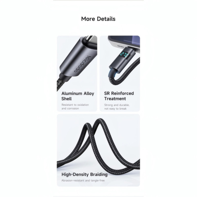 کالای اورجینال مک دودو، واردات انحصاری تیم تکنیک تل | استفاده از فناوری SR Reinforced Treatment در تولید محصول که کابل را در برابر شکستگی و آسیبهای ناشی از فشار مقاوم میسازد | قابلیت انتقال جریان با توان 100 وات و جریان 5 آمپر | دارای نمایشگر LED