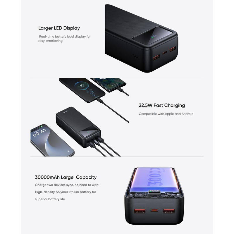 این پاور بانک باطراحی ساده از مواد با کیفیت ساخته شده . این پاور بانک با ظرفیت 30000 میلی آمپر است. دارای سه پورت داخلی و خارجی با قدرت 22.5 وات است.