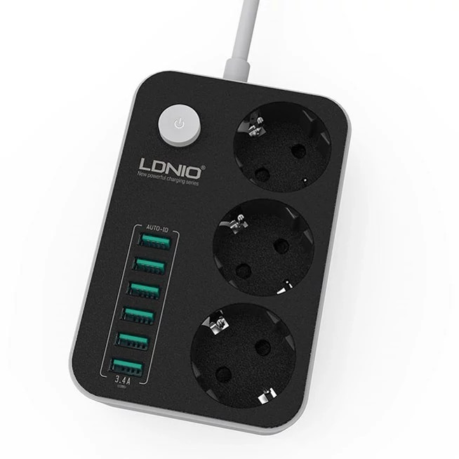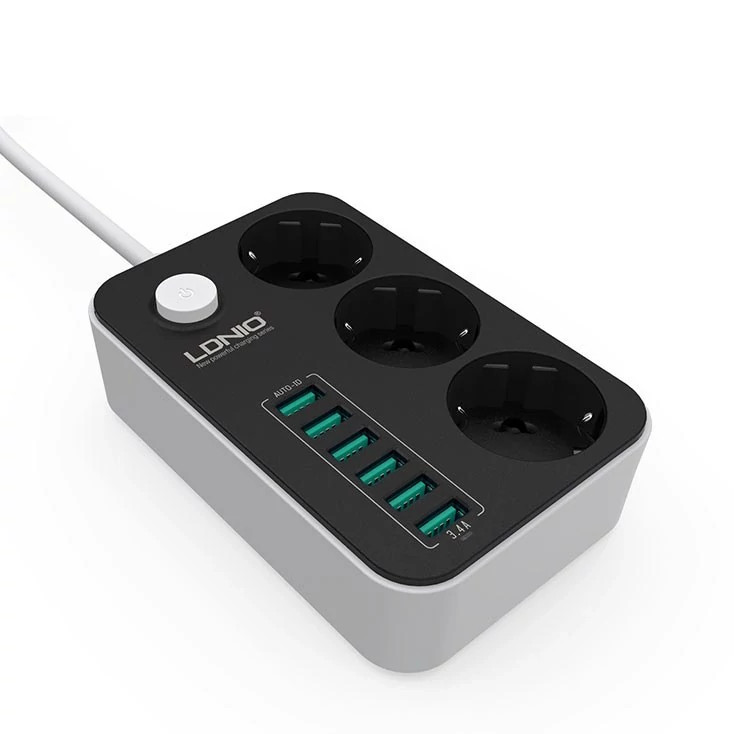 چندراهی SE3631 دارای ۳ پریز برق استاندارد سازگار با دوشاخههای ایرانی و اروپایی است و همچنین مجهز به ۶ پورت USB-A با فناوری Auto-ID میباشد. این پورتها جریان خروجی تا ۳.۴ آمپر / ۱۷ وات را ارائه میدهند و بهصورت هوشمند، شدت جریان مناسب برای هر دستگاه را تنظیم میکنند؛ بنابراین میتوان گوشی، تبلت، هدفون و سایر گجتها را بهصورت همزمان و ایمن شارژ کرد.