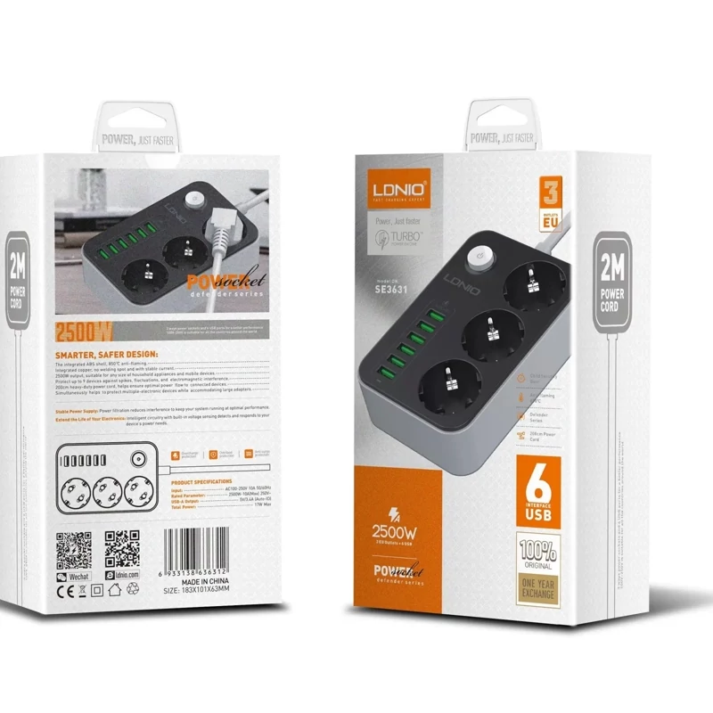 چندراهی SE3631 دارای ۳ پریز برق استاندارد سازگار با دوشاخههای ایرانی و اروپایی است و همچنین مجهز به ۶ پورت USB-A با فناوری Auto-ID میباشد. این پورتها جریان خروجی تا ۳.۴ آمپر / ۱۷ وات را ارائه میدهند و بهصورت هوشمند، شدت جریان مناسب برای هر دستگاه را تنظیم میکنند؛ بنابراین میتوان گوشی، تبلت، هدفون و سایر گجتها را بهصورت همزمان و ایمن شارژ کرد.