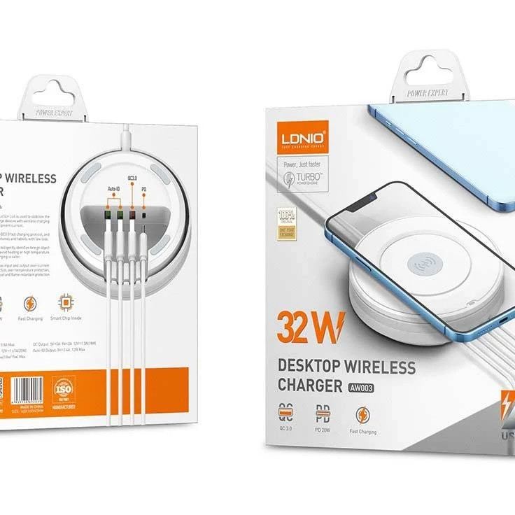 کمپانی الدینیو از تولیدکنندگان در حوزه لوازم برقی است و با استفاده از جدیدترین تکنولوژی های روز اقدام به تولید محصولات متنوع می کند. که از محصولات کاربردی آن که به تازگی وارد بازار شده است می توان به شارژر رومیزی بی سیم الدینیو مدل AW003 اشاره کرد. این محصول علاوه بر پد وایرلس شارژ، 4 پورت مختلف USB برای شارژ به صورت سیمی نیز دارد. با استفاده از این محصول قادر خواهید بود بدون هیچگونه نگرانی 5 دستگاه اعم از تمامی گوشیهای موبایل، تبلت، پخشکنندههای موسیقی قابلحمل، دستگاههای GPS و ... را همزمان شارژ کنید. در شارژر رومیزی بی سیم الدینیو مدل AW003 علاوه بر پد شارژ وایرلس، 1 پورت USB-C و 3 پورت USB-A با تکنولوژی شارژ مختلف قرار دارد. حداکثر خروجی برای پورت USB-C با پشتیبانی PD برابر 20W است. یکی از پورت های USB-A با پشتیبانی از پروتکل QC دارای حداکثر توان 18w و دو تای دیگر با تکنولوژی AutoID دارای حداکثر توان 12W می باشد. توان خروجی کلی این دستگاه 32 وات می باشد. حداکثر توان خروجی وایرلس شارژر الدینیو AW003 برابر 15W است و بین 15/10/7.5/5W متغیر است. در نظر داشته باشید میزان توان خروجی با توجه به تکنولوژی شارژ دستگاه شما تنظیم می شود. همچنین از تکنولوژی Qi پشتیبانی می کند و شما می توانید ایرپاد را نیز با آن به صورت بی سیم شارژ کنید. در ضمن در پک این محصول یک عدد کابل 1.5 متری جهت اتصال به برق نیز قرار دارد.