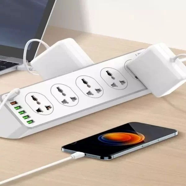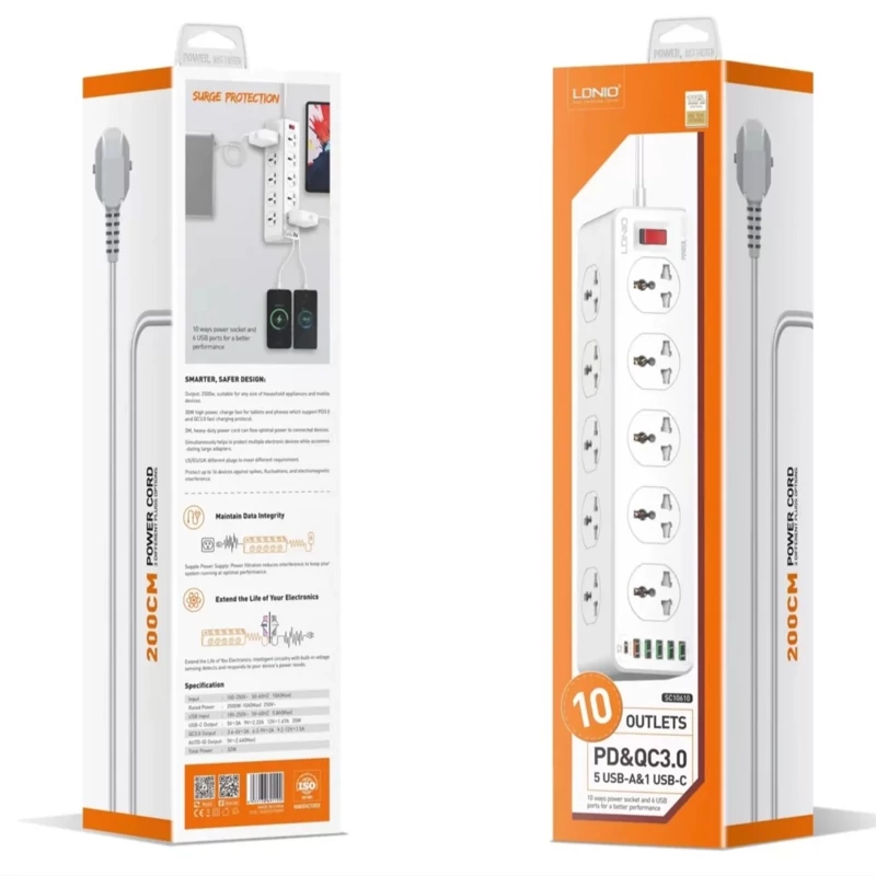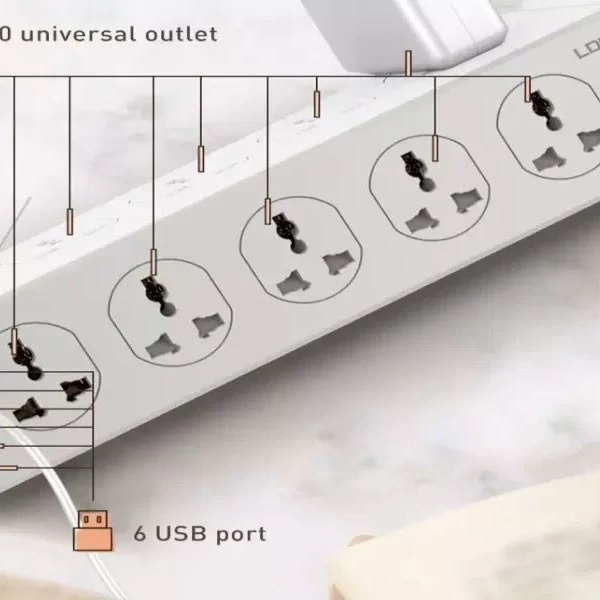 این چندراهی دارای ۱۰ پریز برق استاندارد با طراحی مثلثی و فاصله مناسب برای اتصال انواع دوشاخه و سهشاخه است. همچنین مجهز به ۵ پورت USB-A و ۱ پورت USB-C با پشتیبانی از فناوریهای شارژ سریع PD3.0، QC3.0 و Auto-ID است که امکان شارژ سریع و هوشمند انواع گوشی، تبلت، لپتاپ و گجتهای دیجیتال را فراهم میکند.