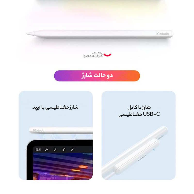 این قلم مک دودو در صورتی که قیمت بسیار به صرفه تری سب به قلم اپل دارد ولی کاملا تمام ویژگی های قلم اپل (Apple Pencil) را دارا می باشد. برخی از مدل های آیپد اپل سازگار با این قلم ساخت شرکت مک دودو به شرح ذیل می باشد : آیپدهای ipad سری 6 و 7 و 8 و 9 و 10 / آیپد مینی ipad mini سری 5 و 6 / آیپد ایر ipad Air سری 3 و 4 و 5 / آیپد پرو 11 اینچ ipad Pro 11 inch سری 1 و 2 و 3 و 4 / آیپد پرو 12.9 اینچ ipad Pro 12.9 inch سری 3 و 4 و 5 و 6 در ساخت این محصول از تکنولوژی های پیشرفته تشخیص هوشمند زاویه شیب قلم و همچنین تشخیص فشار وارد شده توسط دست بر روی نوک قلم ، استفاده شده است که سبب می شود با تغییر فشار دست و زاویه شیب قلم، ضخامت خطوطی که روی نمایشگر آیپد خود می کشید به صورت اتوماتیک مثل مداد طبیعی سریع تغییر کند و بتوانید به راحتی خطوط نازک و پهن ترسیم کنید با استفاده از فناوری حذف سهوی اثر دست بر روی صفحه نمایش ، شما بدون استرس و نگرانی خیلی روان و باسرعت بالا به طراحی خود ادامه می دهید در صورتی که اکثر قلم های موجود در بازار این ویژگی و خصوصیت جذاب و کاربردی را ندارند جنس نوک قلم از پلی اکسی متیلن (POM) قابل تعویض می باشد که بسیار مقاوم بادوام می باشد و بدون کمترین اصطکاک بسیار روان می تواند روی صفحه نمایش حرکت کند بدون اینکه کوچکترین آسیبی به صفحه نمایش دستگاه شما وارد آورد. در بسته بندی این کالا یک نوک قلم اضافی هم جهت تعویض در مواقع موردنیاز قرارداده شده است انتهای بالایی قلم طوری طراحی شده که وقتی آن قسمت رو کمی فشار میدهید و نگه میدارید قلم روشن می شود و یک LED با نوری بسیار جذاب آبی رنگ به شما وضعیت روشن یا خاموش بودن قلم را نشان می دهد