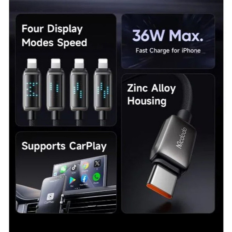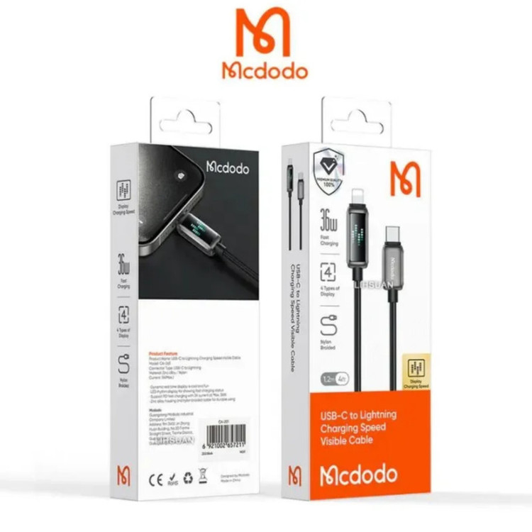 کابل تبدیل تایپ سی به لایتنینگ مک دودو مدل CA-263 با طول 120 سانتی متر، برخوردار از کانکتور های تایپ سی و لایتنیگ ساخته شده از جنس آلیاژ روی مقاوم، دارای نشان استاندارد CE ,RoHS میباشد. این کابل از فناوری شارژ سریع و PD با توان خروجی 36 وات و شدت جریان عبوری 3 آمپر پشتیبانی میکندومجهز به چراغ LED است دارای طول کابل 120 سانتی متری و با روکشی از جنس نایلون بهم بافته شده مقاوم در برابر کشش و پارگی میباشد