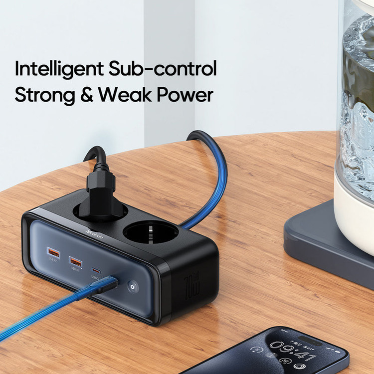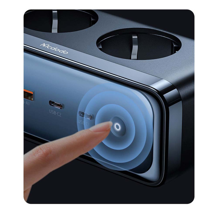 شارژر رومیزی و محافظ برق 70 وات مک دودو مدل CH-4610 جنس بدنه از پلی کربنات ضد حریق مقاوم تاحرارت 750 درجه سانتی گراد ساخته شده است.دارای 2 خروجی پورت USB-A با توان خروجی 30 وات و 2 پورت خروجی شارژ سریع PD تایپ سی 70 واتی و قابلیت شارژ همزمان 4 گوشی موبایل و تبلت و لپ تاپ و نوت بوک و …را دارد.دارای تکنولوژی گالیم نیترید GaN و برخورداری از بازدهی بالا در حجم و ابعاد بسیار کوچکتر میباشد.دو پورت پریز برق قابلیت ساپورت شارژ دستگاه های لوازم خانگی مختلف مانند چای ساز و سشوار و قهوه ساز و … با حداکثر توان 2500 وات و 240 ولت ورودی را داراست.دارای گواهینامه معتبر ایمنی و سلامت CE / FCC / RoHS و دارای کابل اتصال برق 1.5 متری بسیار ضخیم با قطر هسته مسی داخلی بسیار ضخیم میباشد.