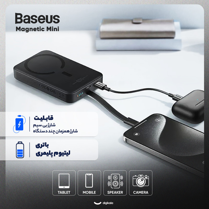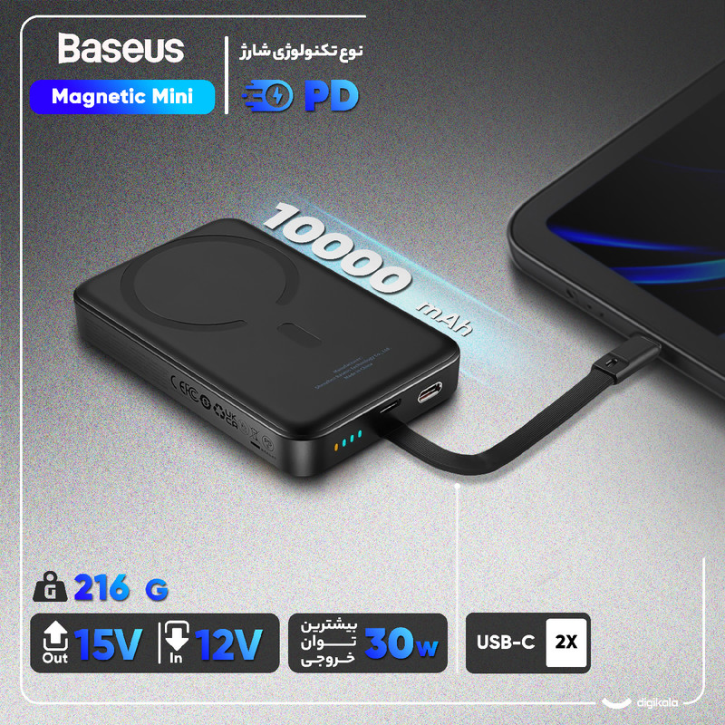 پاوربانک بیسیم 30 وات باسئوس مدل Magnetic Mini ظرفیت 10000 میلی آمپر ساعت