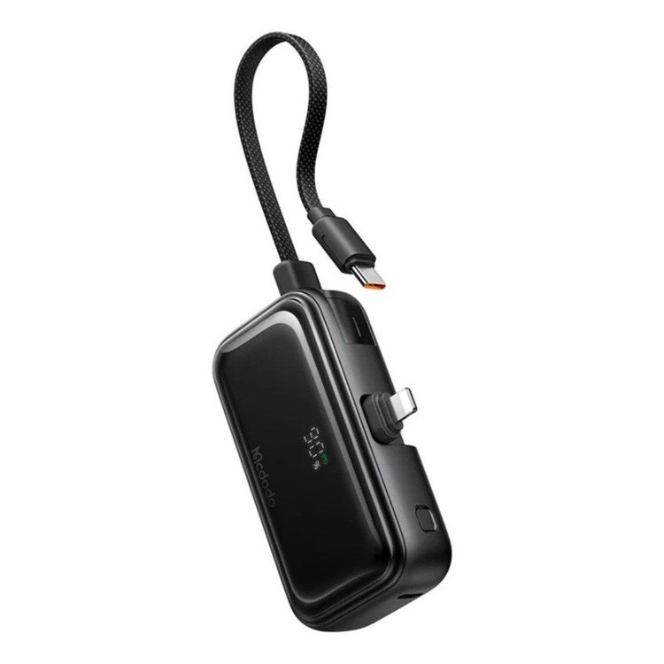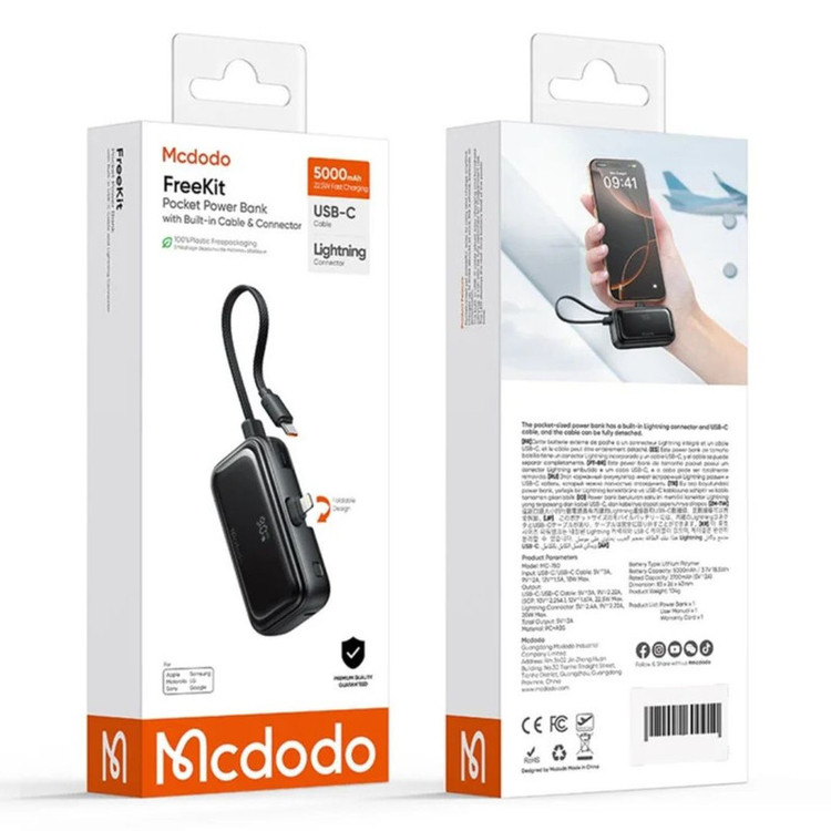 پاوربانک Mcdodo MC-7800 سری Freekit با ظرفیت ۵۰۰۰ میلیآمپرساعت (۱۸.۵ واتساعت) و طراحی هوشمندانهای که شامل کابل USB-C داخلی و مبدل Lightning داخلی است، منبع انرژی ایدهآل و جمعوجوری برای کاربرانی است که میخواهند بدون همراه داشتن کابل، گوشیهای آیفون و دستگاههای USB-C را بهسادگی شارژ کنند. نمایشگر دیجیتال دقیق تعبیهشده در این دستگاه، وضعیت شارژ را لحظهای به شما اطلاع میدهد تا بهتر بتوانید مدیریت انرژی داشته باشید. توان ورودی دستگاه تا ۱۸ وات (با ولتاژهای 5V⎓3A، 9V⎓2A و 12V⎓1.5A) بوده و در خروجی ظرفیت ارائه تا ۲۲.۵ وات را دارد؛ کانال USB-C (چه کابل داخلی و چه پورت) از فناوریهایی مثل QC، PD و SCP پشتیبانی میکند و جریانهایی مانند 5V⎓3A، 9V⎓2.22A، 10V⎓2.25A و 12V⎓1.67A را تامین مینماید. از طرفی، خروجی Lightning هم توانایی شارژ تا 20 وات و ولتاژهای 5V⎓2.4A و 9V⎓2.22A را داراست، و در هنگام شارژ همزمان، مجموع جریان تا 5V⎓3A فراهم میشود . با وزن سبک حدود ۱۰۴ گرم، این پاوربانک همراهی بیدغدغه برای سفر، محل کار یا استفاده روزمره است. استفاده از مواد با کیفیت، طراحی جمعوجور، نمایشگر LED و سیستمهای حفاظتی داخلی مانند جلوگیری از اتصال کوتاه، اضافهبار و داغ شدن، آن را به گزینهای مطمئن و کاربرپسند تبدیل کرده است. اگر به دنبال پاوربانکی هستید که هم کوچک باشد، هم سریع و دقیق شارژ کند، و خیالتان از شارژ دستگاههای مختلف راحت باشد، Mcdodo MC-7800 انتخاب هوشمندانهای برای شماست.