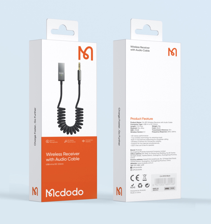 کابل تبدیل صوتی مکدودو مدل CA-8700 در واقع یک گیرنده بلوتوثی حرفهای است که برای تبدیل دستگاههای فاقد بلوتوث مانند ضبط خودرو یا اسپیکرهای قدیمی به پخشکننده بیسیم طراحی شده. این مدل با استفاده از بلوتوث نسخه 5.1 اتصال پایدار و سریع تا شعاع ۱۰ متر را فراهم میکند و با تمامی دستگاههای Android، iOS و ویندوز سازگار است. طراحی کابل بهصورت فنری و جمعشونده است که در حالت عادی ۴۵ سانتیمتر و در حالت کشیده تا ۱۷۰ سانتیمتر طول دارد. بدنه از نایلون کنفی بافتهشده و کانکتورها از آلیاژ آلومینیوم با آبکاری طلا ساخته شدهاند که مقاومت بالا و انتقال صدای باکیفیت را تضمین میکنند. این مدل دارای چیپست رمزگشایی دیجیتال DAC و میکروفون داخلی HD است که امکان مکالمه هندزفری را فراهم میکند. کابل CA-8700 از فرکانس ۲۰Hz تا ۲۰kHz پشتیبانی میکند و صدایی HD و استریو با نسبت سیگنال به نویز ۹۰ دسیبل منتقل میکند. قابلیت اتصال همزمان به دو دستگاه، اتصال خودکار پس از بار اول، چراغ LED روی کابل برای نمایش وضعیت اتصال، و سازگاری با انواع ضبط خودرو، اسپیکر، تلویزیون، لپتاپ و هدفونهای AUX از دیگر ویژگیهای آن است. این کابل بدون نیاز به نصب نرمافزار و بهصورت Plug & Play عمل میکند و دارای گواهینامههای CE، FCC و RoHS است.