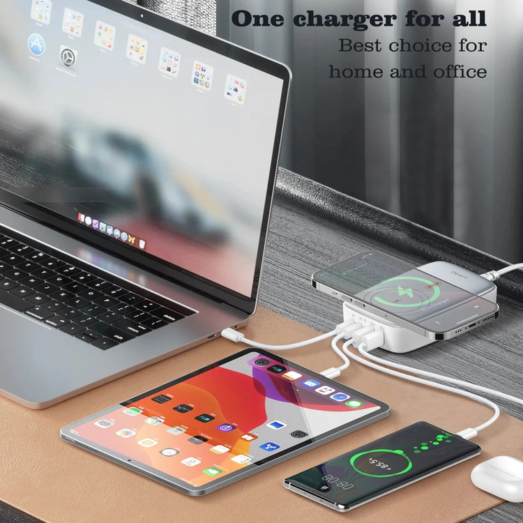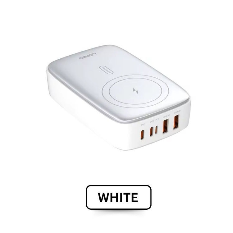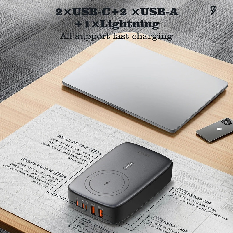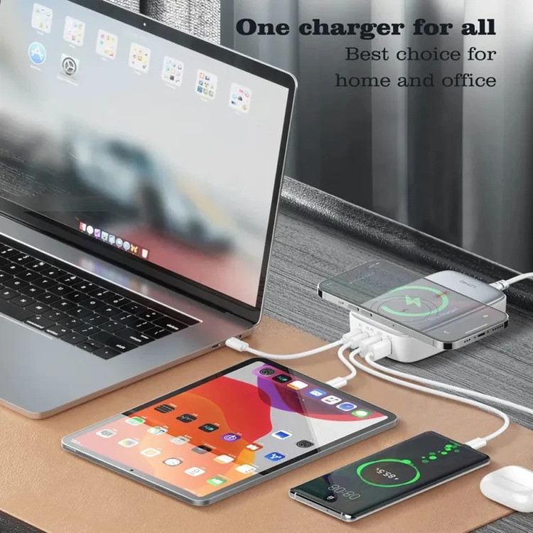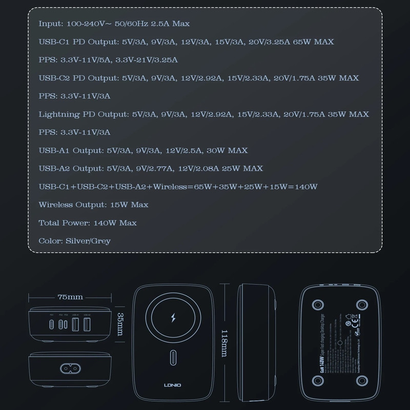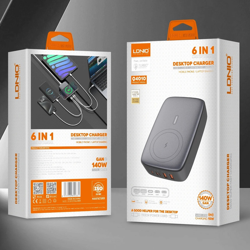 شارژر140وات رومیزی LDNIO 6IN1-Q4010 با توان خروجی کلی 140 وات و داشتن 5 پورت خروجی و 1 پورت خروجی وایرلس شارژ متشکل از 2 عدد USB و 2 عدد Type C و 1 عدد لایتنینگ و همچنین محل قرار گیری وایرلس شارژ می تواند انتخاب خوبی برای میز کارتان باشد. این شارژر رومیزی با فناوری ساخت گالیم نیترات GaN طراحی شده است و از مواد PC نسوز تا 850 درجه سانتیگراد ساخته شده است و به عنوان هاب شارژر مورد استفاده قرار می گیرد. هاب شارژر الدینیو 6IN1-Q4010 با پروتکل شارژ گوشی های آیفون، سامسونگ، هوآوی، شیائومی و ویوو سازگاری دارد و از پروتکل های فست شارژ QC4.0, PD3.0, SCP, VOOC, AFC, FCP و Auto ID پشتیبانی می کند. درگاه تایپ سی این محصول با توان 65 وات، مناسب شارژ لپ تاپ نیز است. شارژر LDNIO A4809C در برابر توان، ولتاژ، شارژ شدن و دمای اضافی مقاوم است. همچنین در برابر اتصال کوتاه و میدان مغناطیسی و ولتاژ پایین نیز ایمن است. این شارژر دارای 5 پورت خروجیست که شامل 2 عدد USB و 2 عدد تایپ سی و 1 پورت لایتینگ و 1 پورت وایرلس با توان خروجی 3 تا 15 وات که میتوان ساعت هندزفری و موبایل وایرلس خود را شارژ کرد که یعنی شما می توانید همزمان 5 دستگاه خود را با آن شارژ کنید.