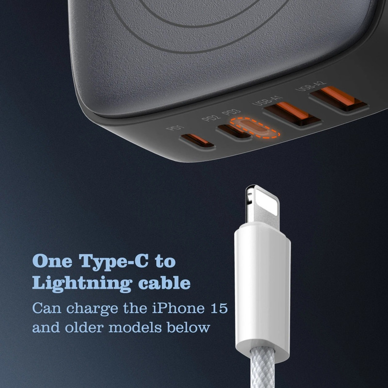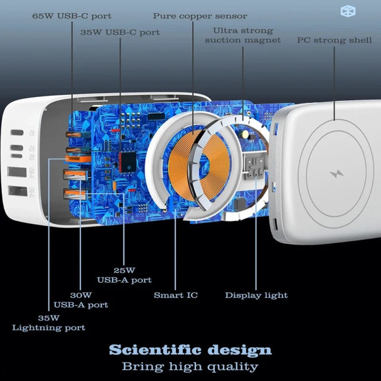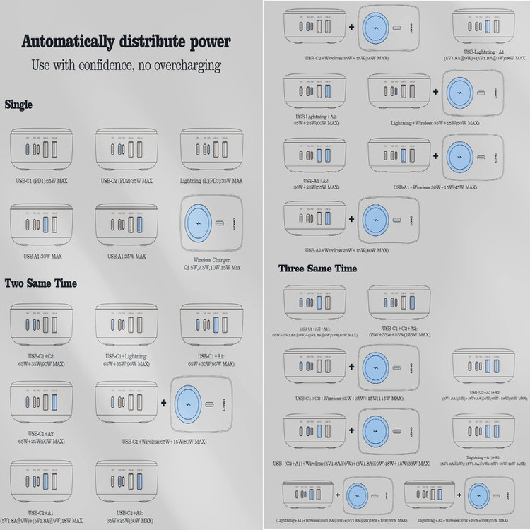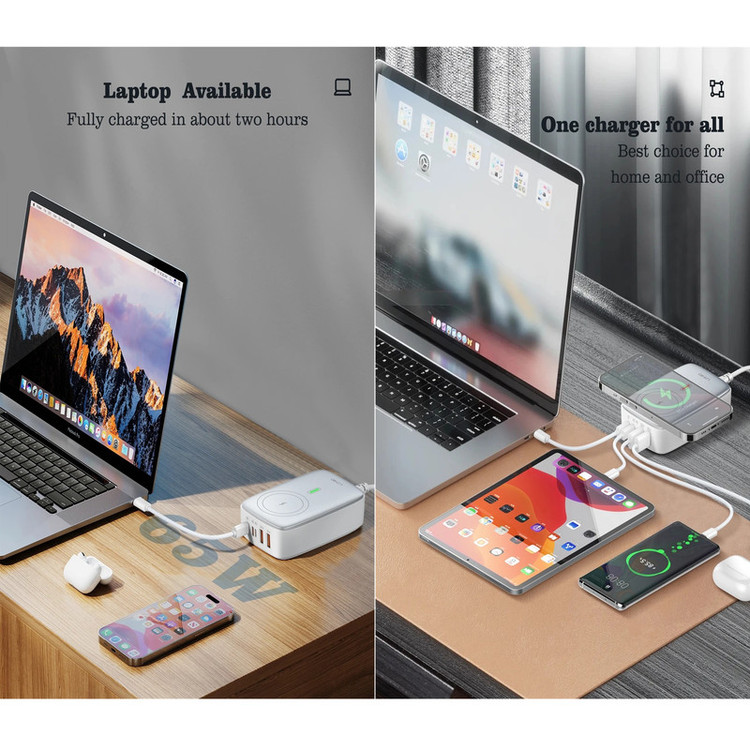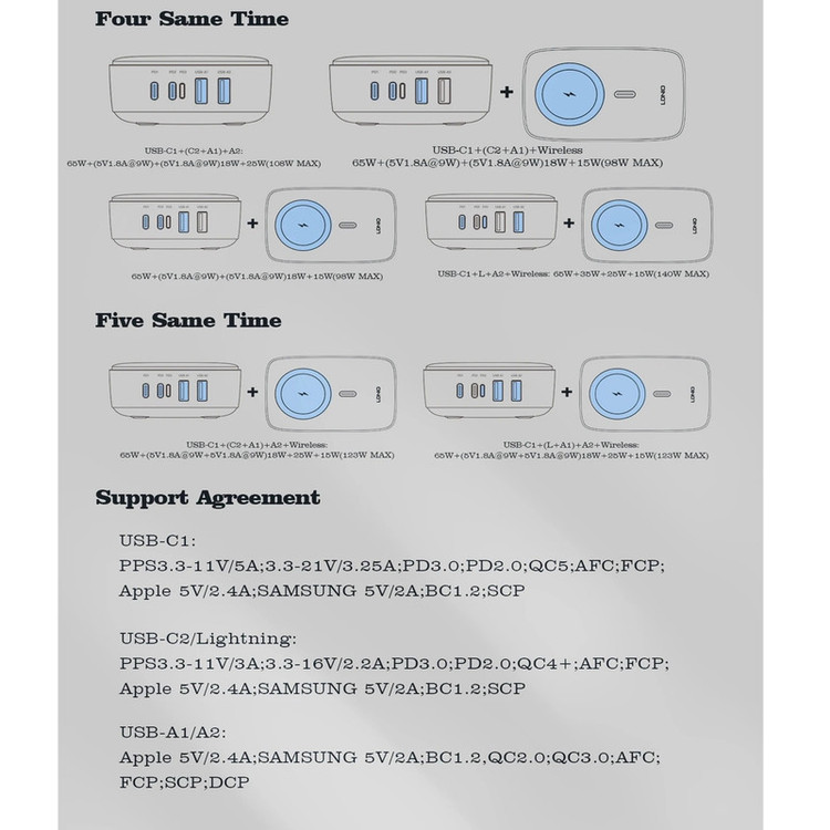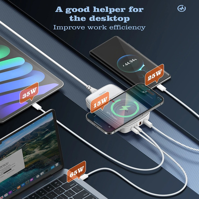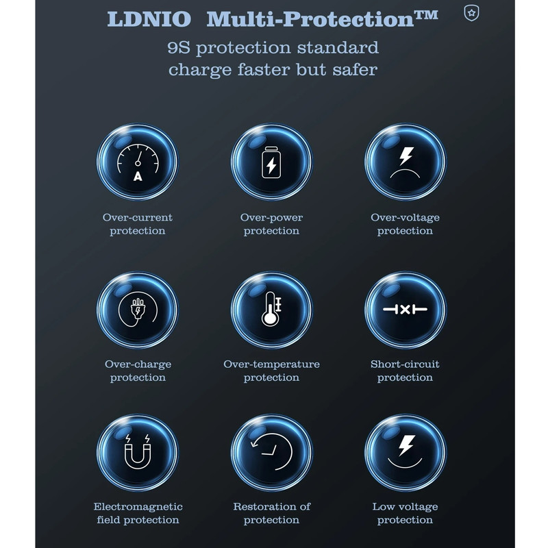 شارژر140وات رومیزی LDNIO 6IN1-Q4010 با توان خروجی کلی 140 وات و داشتن 5 پورت خروجی و 1 پورت خروجی وایرلس شارژ متشکل از 2 عدد USB و 2 عدد Type C و 1 عدد لایتنینگ و همچنین محل قرار گیری وایرلس شارژ می تواند انتخاب خوبی برای میز کارتان باشد. این شارژر رومیزی با فناوری ساخت گالیم نیترات GaN طراحی شده است و از مواد PC نسوز تا 850 درجه سانتیگراد ساخته شده است و به عنوان هاب شارژر مورد استفاده قرار می گیرد. هاب شارژر الدینیو 6IN1-Q4010 با پروتکل شارژ گوشی های آیفون، سامسونگ، هوآوی، شیائومی و ویوو سازگاری دارد و از پروتکل های فست شارژ QC4.0, PD3.0, SCP, VOOC, AFC, FCP و Auto ID پشتیبانی می کند. درگاه تایپ سی این محصول با توان 65 وات، مناسب شارژ لپ تاپ نیز است. شارژر LDNIO A4809C در برابر توان، ولتاژ، شارژ شدن و دمای اضافی مقاوم است. همچنین در برابر اتصال کوتاه و میدان مغناطیسی و ولتاژ پایین نیز ایمن است. این شارژر دارای 5 پورت خروجیست که شامل 2 عدد USB و 2 عدد تایپ سی و 1 پورت لایتینگ و 1 پورت وایرلس با توان خروجی 3 تا 15 وات که میتوان ساعت هندزفری و موبایل وایرلس خود را شارژ کرد که یعنی شما می توانید همزمان 5 دستگاه خود را با آن شارژ کنید.