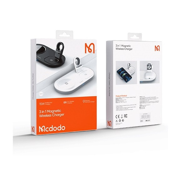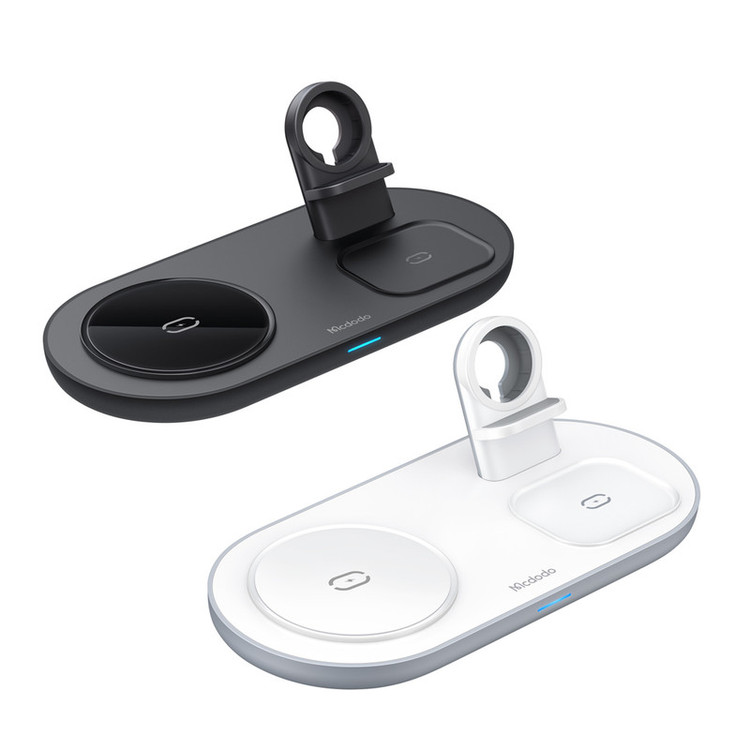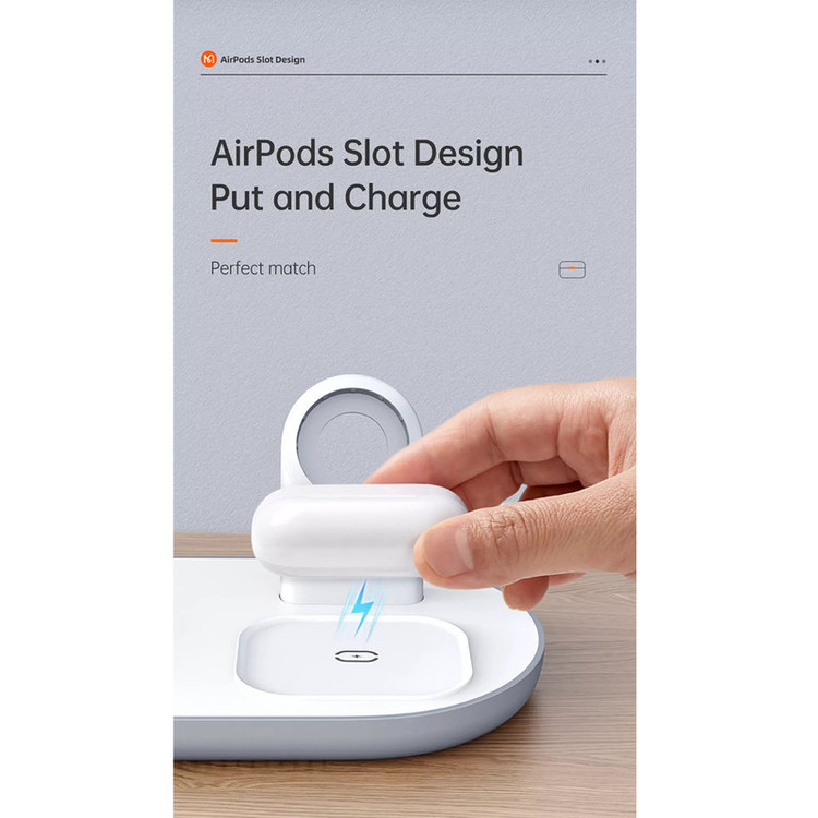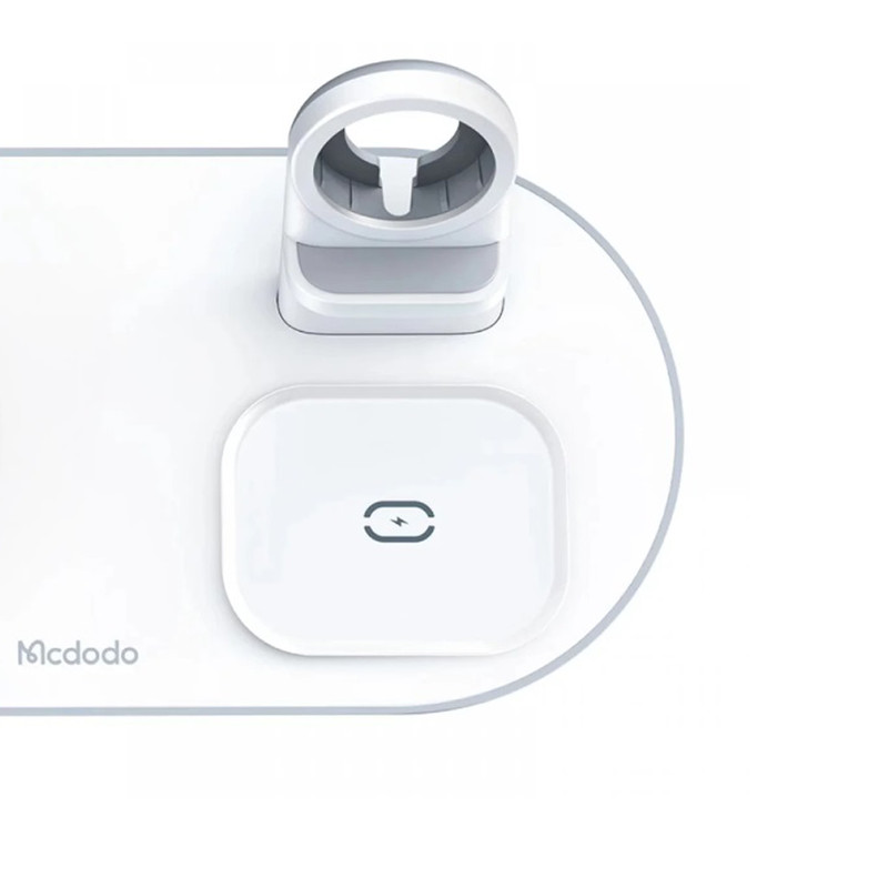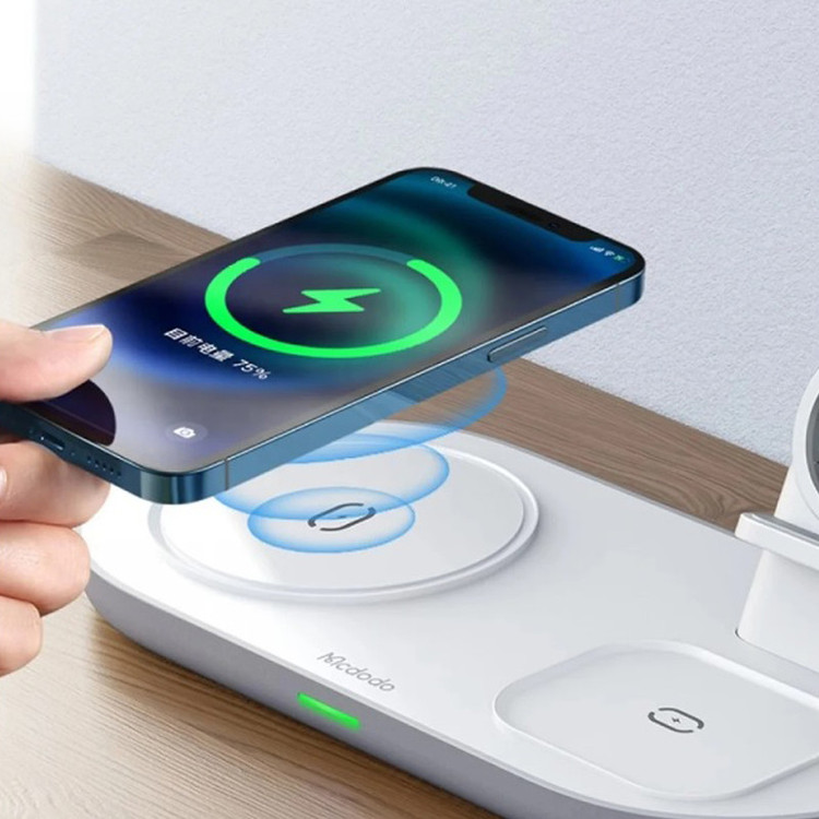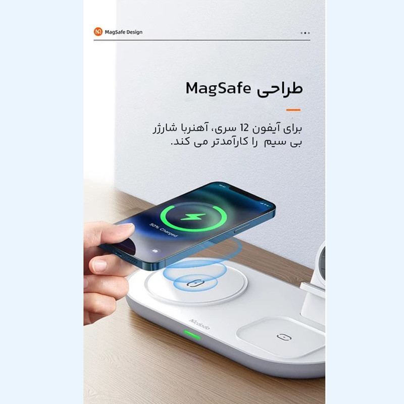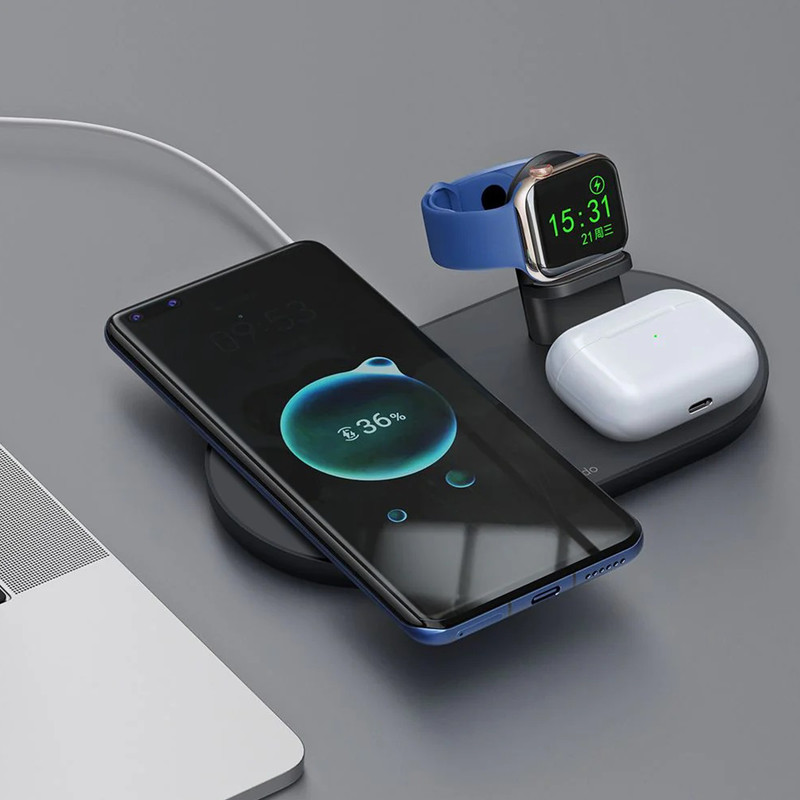 پایه شارژ 3 کاره مناسب برای اپل واچ ، ایرپاد اپل (یا هدفونهای مجهز به فناوری شارژ بیسیم) و تمامی تلفنهای مجهز به تکنولوژی شارژ بیسیم. در این محصول محلی برای قرار دادن گوشی تلفن،هدفونهای بیسیم با تکنولوژی شارژ بیسیم مانند ایرپاد و همچنین محلی مخصوص اپل واچ وجود دارد. محل قرار دادن اپل واچ طوری طراحی شده است که شما با قرار دادن شارژر مگنتی ساعت خود میتوانید ساعت را در آن قرارداده و شارژ نمائید. این شارژر مجهز به درگاه TYPE-C میباشد که کابل مربوطه با بهترین کیفیت نیز درون جعبه دستگاه وجود دارد. حداکثر توان خروجی دستگاه 15 وات میباشد و البته از مقادیر پایینتر 5 یا 10 وات هم پشتیبانی میکند. در محل قرارگیری گوشی مگنت قرارداده شده که با وجود این ویژگی از شارژ سریعتر آیفونهای سری 12 میتوانید اطمینان حاصل نمائید. استند دارای دو کویل مغناطیسی قدرتمند است. این دو کویل علاوه بر قدرت بالایی که دارند کاملا مستقل از هم نیز عمل میکنند. بنابراین در فرایند شارژ همزمان هیچ اختلالی ایجاد نمیشود.